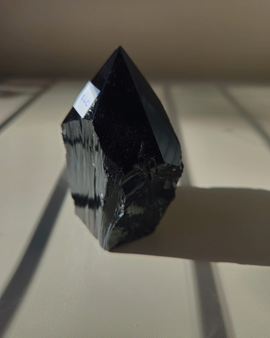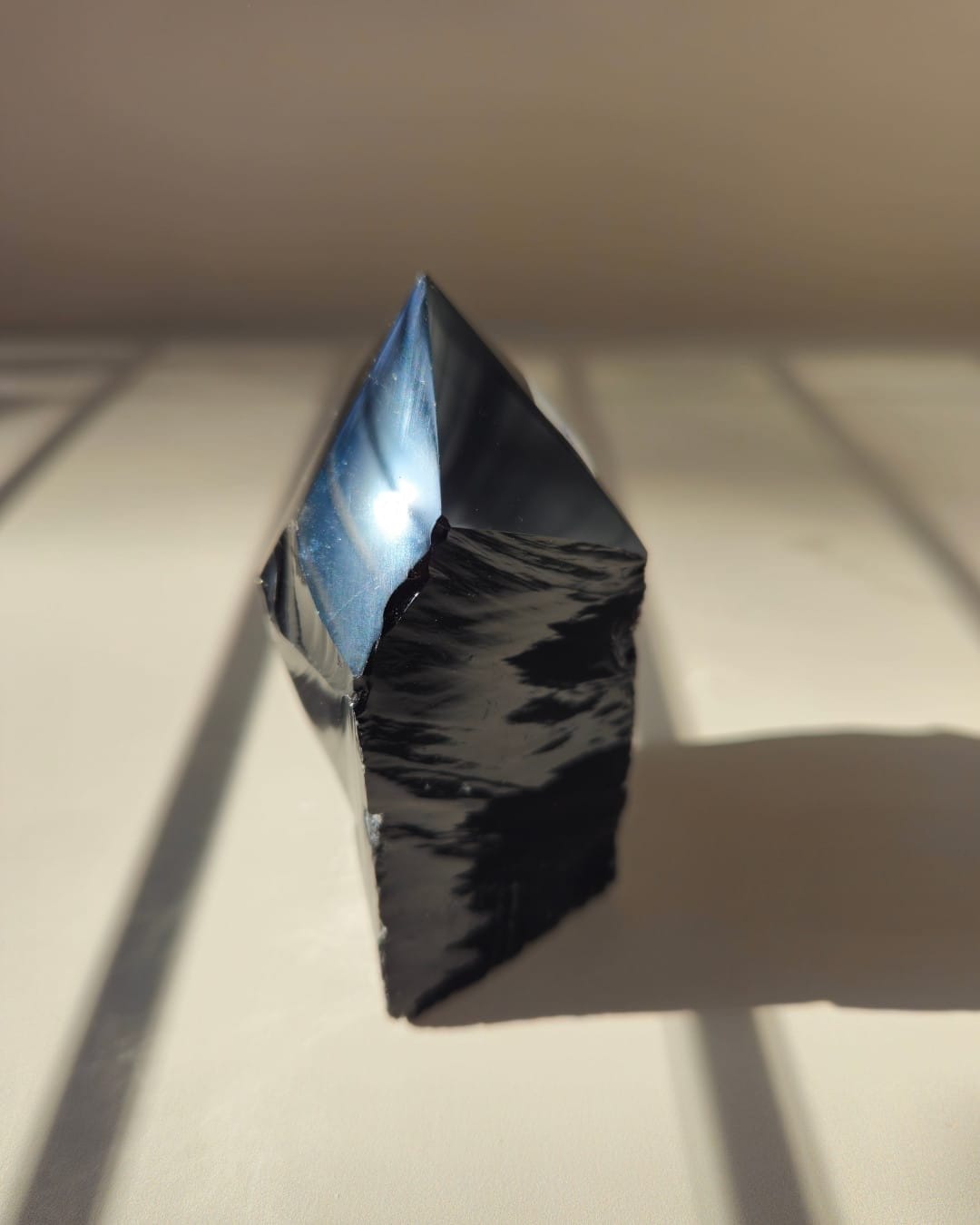 This 8cm Black Obsidian generator is a substantial, powerful piece — the perfect size for serious protection work or as a statement display piece. The polished top catches light beautifully, revealing the deep, glossy black that’s signature to quality obsidian. The tiny chip at the tip adds character and reminds you that this is a natural piece with its own unique story.
