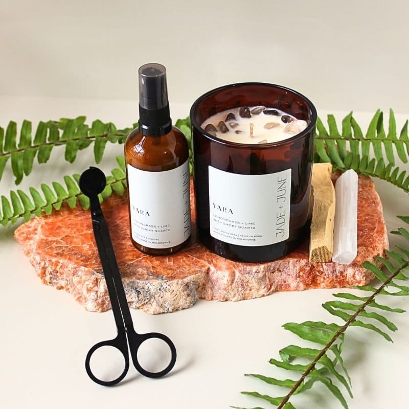 Elevate your space with the Yara Ritual Bundle, a thoughtfully curated collection designed to infuse your environment with uplifting citrus notes and the grounding energy of Smoky Quartz. This bundle brings together our signature Yara Candle, Room Spray, and Wick Trimmers, complemented by a Selenite Stick and a Palo Santo Stick, all presented in a calico bag for added elegance.