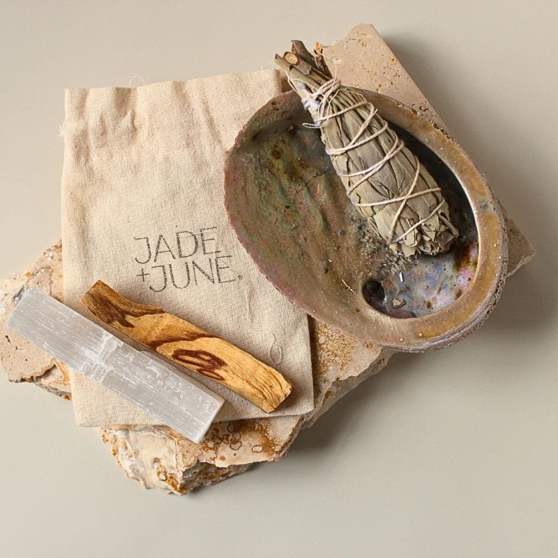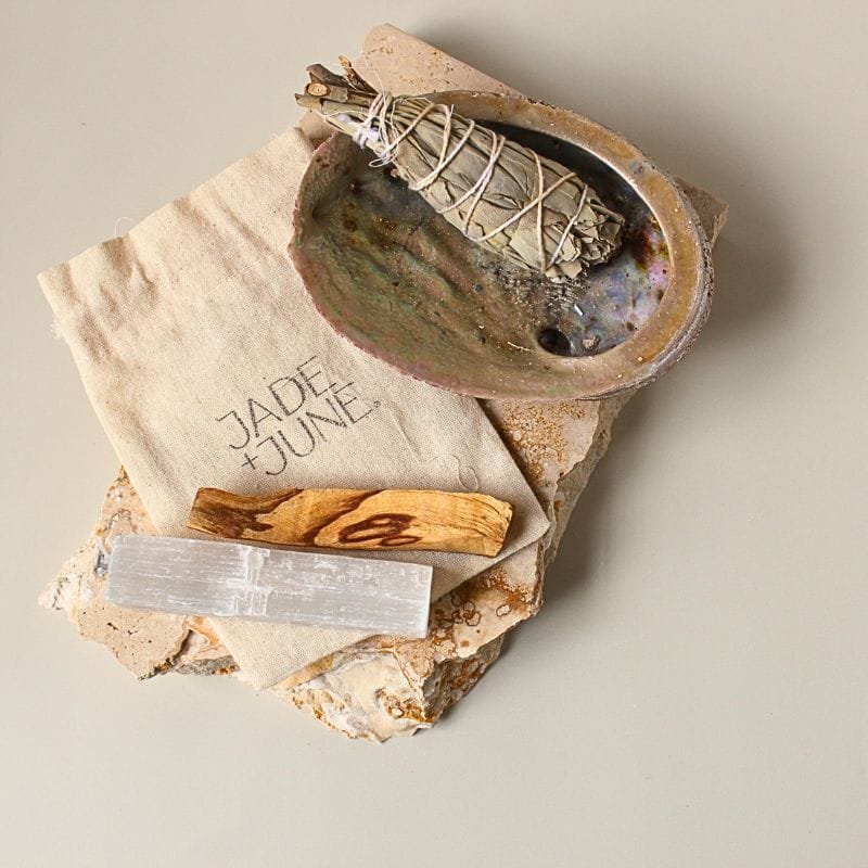 Cleanse your space with the Cleansing Kit, a thoughtfully curated bundle designed to cleanse, purify, and balance your environment and spirit. This all-inclusive kit contains three powerful tools for spiritual cleansing: a luminous piece of selenite, a sustainably harvested palo santo stick, and a traditional white sage stick, accompanied by a Mother-of-Pearl shell to hold your sage as you smudge. Presented in a nice calico bag.